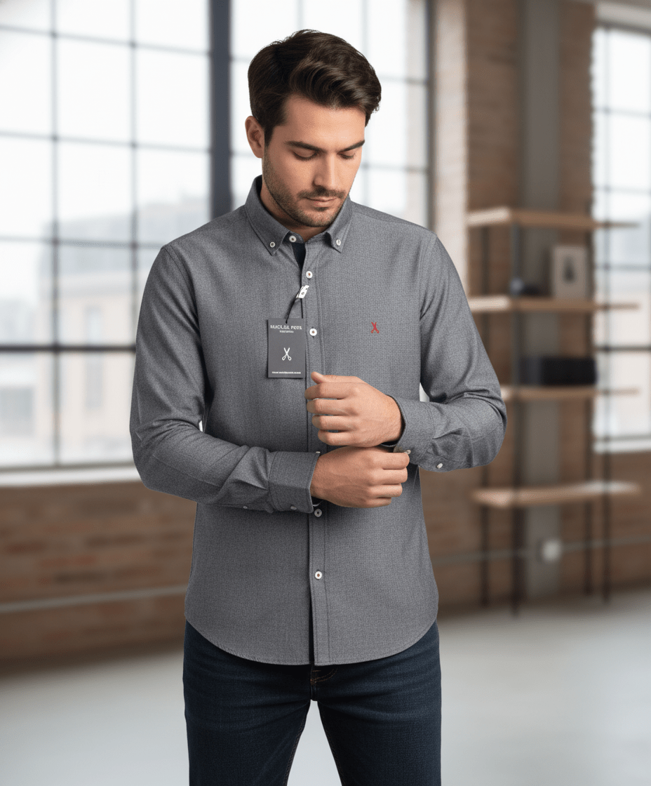Descubre la Camisa Estructura, una elección elegante y versátil para tu guardarropa casual. Esta pieza se destaca por su hilo rojo presente en los botones, brindando un toque de contraste y estilo único.