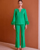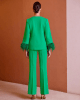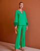 Este Conjunto Elegante de Dos Piezas Carla Ruiz se define por su sofisticación y estilo único. El conjunto consta de una blusa de corte recto con un elegante escote en V y espalda cerrada. Lo que realmente pone este diseño aparte son sus mangas largas, acabadas con un sublime detalle de plumas que añade un toque de glamour y movimiento inigualable.