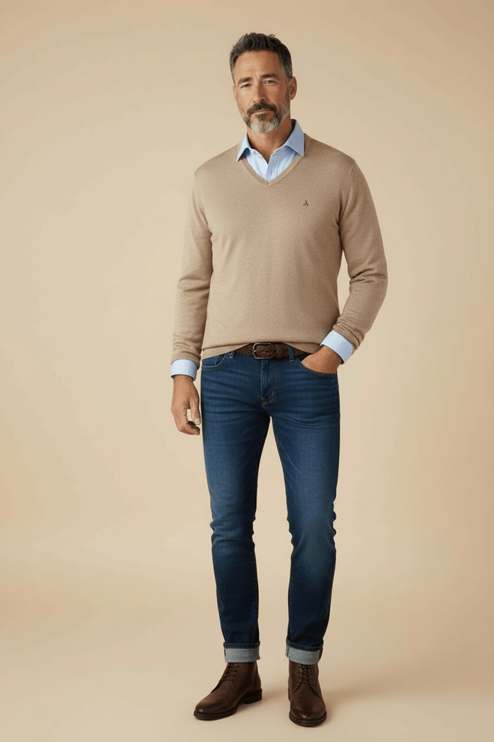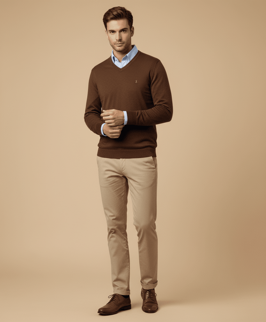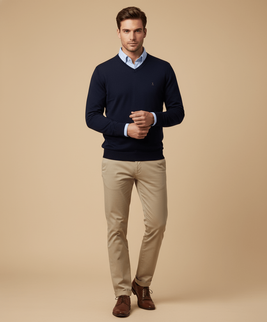 Estilo y comodidad se unen en este elegante Jersey de Punto Fino con Cuello Pico. Confeccionado en cotton de alta gama, este jersey es tan suave como duradero, garantizando un uso prolongado sin sacrificar la comodidad.