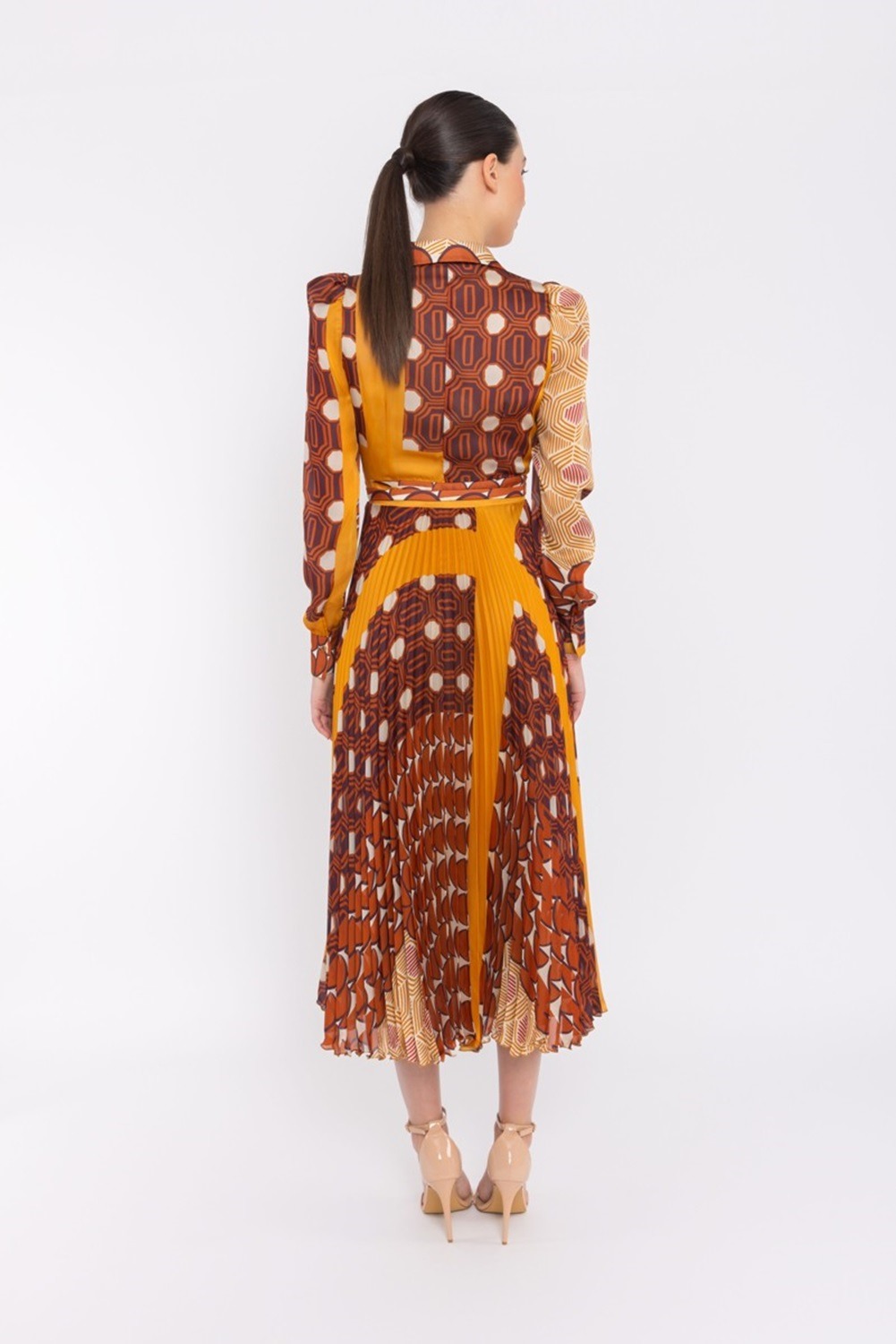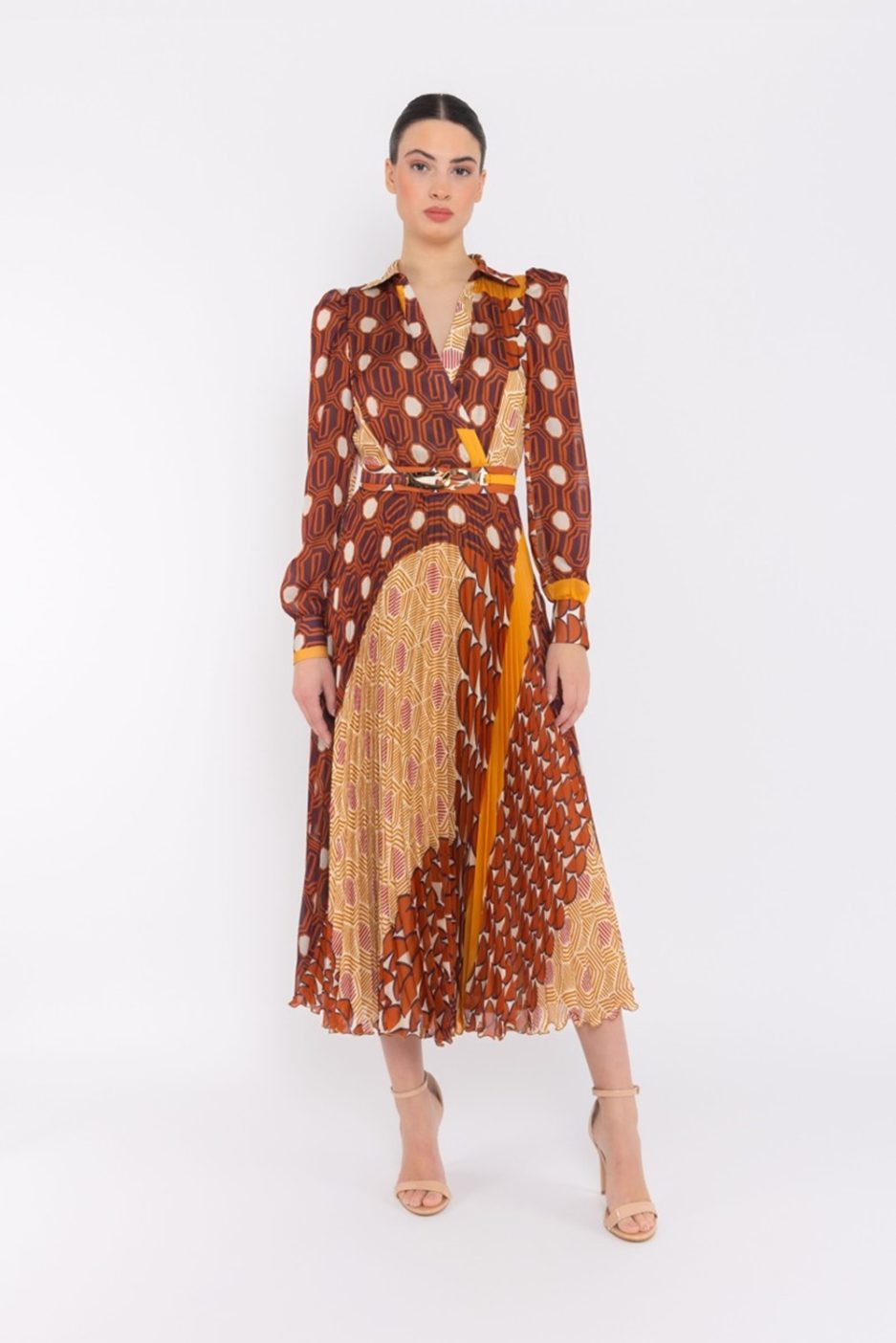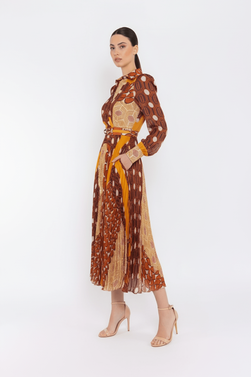 Su diseño estampado irregular ofrece un atractivo visual único y moderno. Además, el corte midi y la falda plisada aportan un toque clásico y siempre en tendencia. Este vestido es ideal para cualquier ocasión, ya sea una reunión casual, una fiesta o una salida nocturna.
